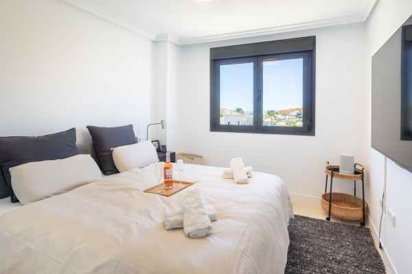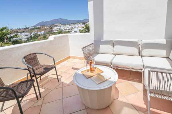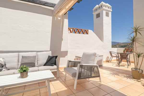 Looking for a luxurious outdoor escape? Look no further. This stunning duplex penthouse is your gateway to serene coastal living, nestled in a peaceful enclave with panoramic views of the sea, golf courses, and even the distant Moroccan coastline.