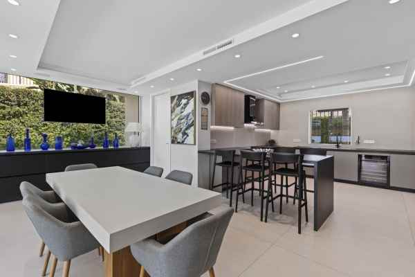 A grand open entrance hall leads into the light-filled living areas with vaulted ceilings enhanced by special lighting, large format tiles, and big picture windows that frame the surrounding garden. The open-plan kitchen is both stylish and functional, complete with a breakfast bar, seamlessly connecting to the dining and living spaces. The living room also benefits from a modern gas fireplace, creating a warm and elegant focal point.