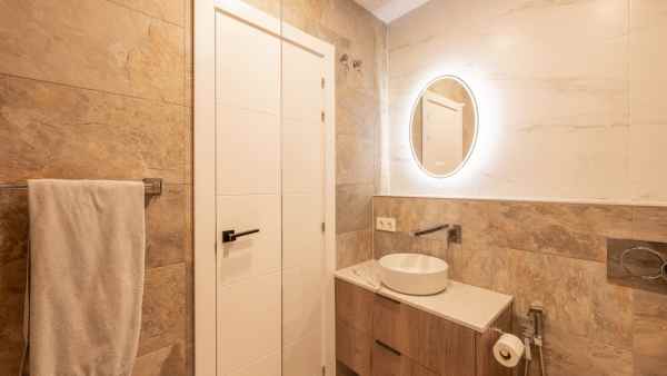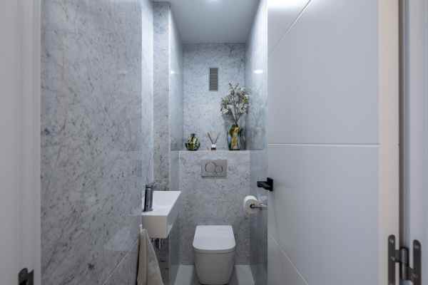 This spacious first-floor apartment features three bedrooms, three bathrooms, and a guest toilet.