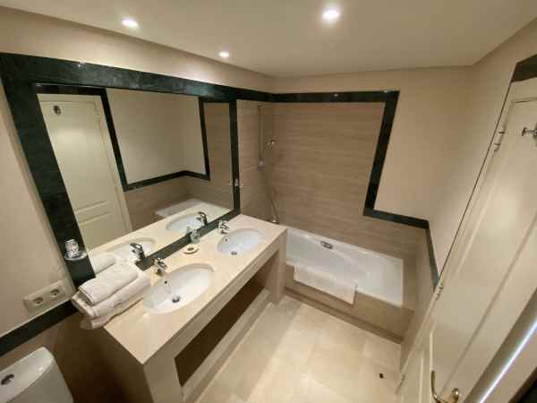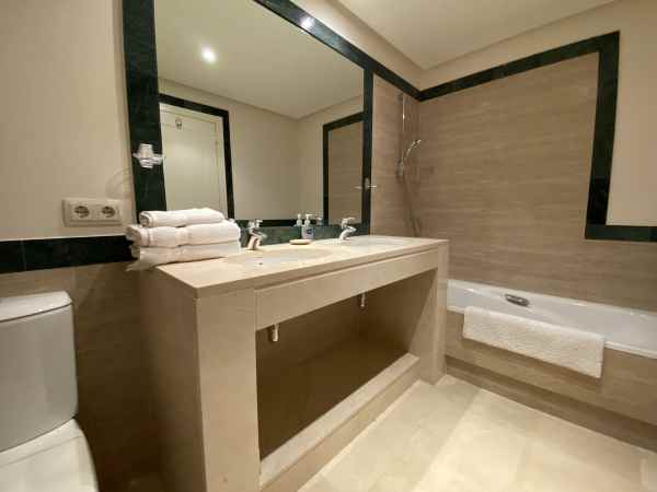 The master bedroom is extremely generous, and features fitted wardrobes, and lots of storage space. There is a large en suite bathroom featuring marble and granite surrounds, double sink, bidet and bath with shower over.