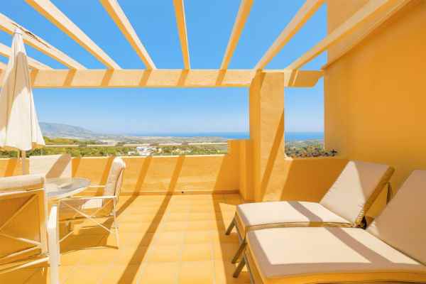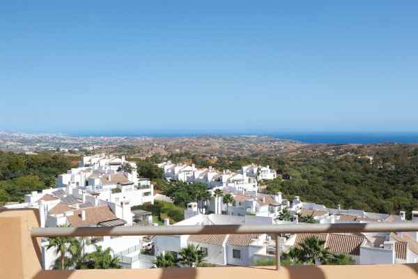 This excepcional two bedroom top floor apartment is located in a gated complex in La Mairena. ann elevated area located in the hills above the beaches of Elviria and East Marbella. The residents of La Mairena enjoy low density relaxed living in natural surroundings. The area has a number of renowned complexes, high end luxury villas of enjoying amazing views. The apartment itself has hot and cold air-conditioning , high quality marble flooring, a granite worktop in the kitchen and a larger than average living room and a good sized terrace with amazing sea view, mountain and coastal view. Included in the price is a very useful private store room annd a private covered parking space. The complex has community gardens, swimming pools and even paddle tenis courts available for its owners.