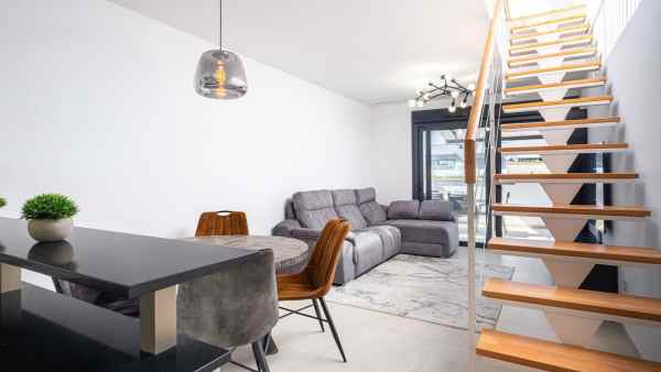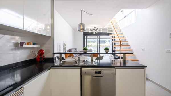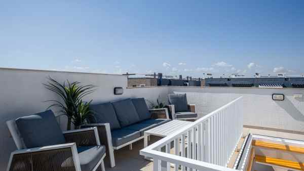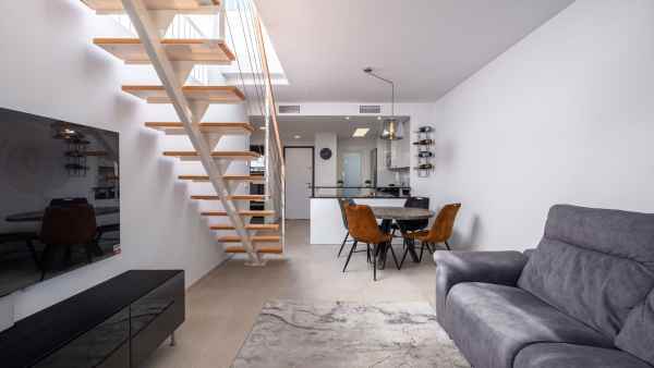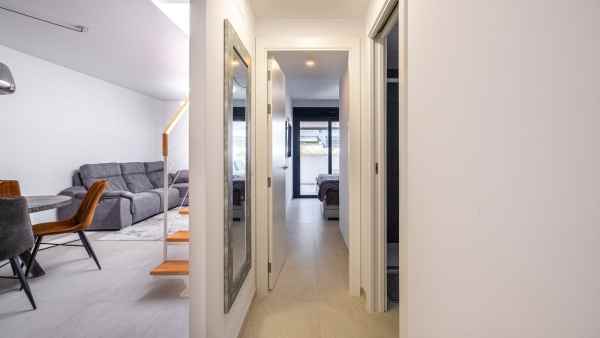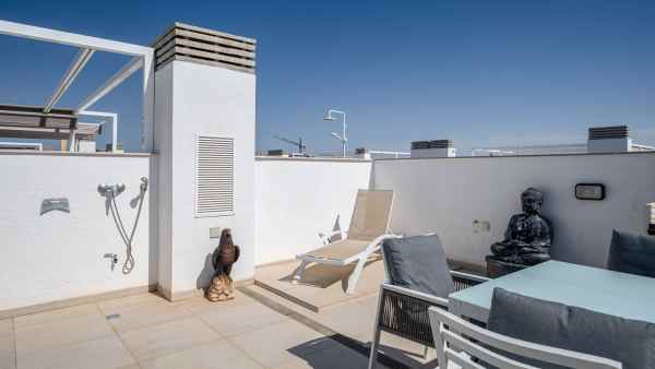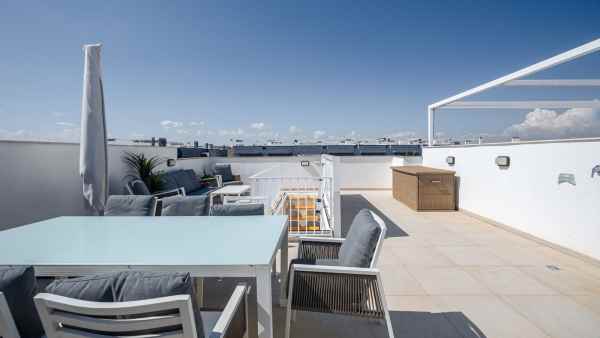 From the living room, an internal staircase leads to the private rooftop terrace – the true highlight of the home. There's space for a dining area, lounge corner, sunbeds, an outdoor kitchen, and a shower. The view is open and stretches from Torrevieja in the north to La Manga in the south, with both the sea and pool area in sight.