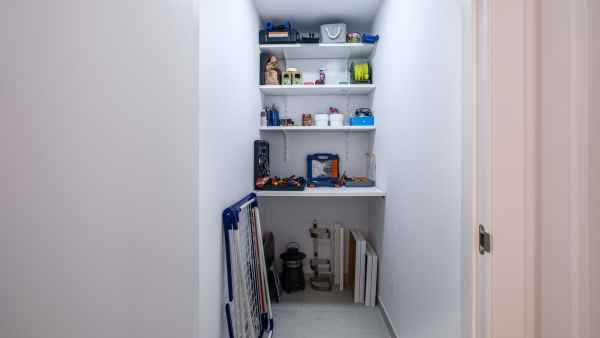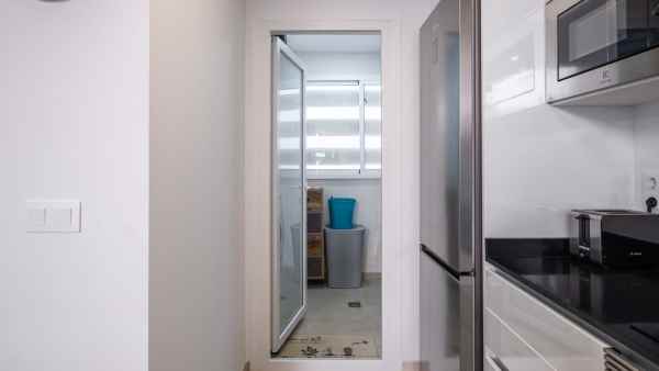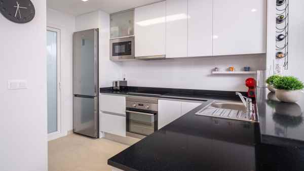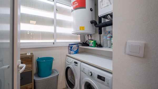 The open-plan kitchen comes fully equipped with modern, high-quality appliances. Adjacent to the kitchen is a separate laundry room with a washing machine, dryer, water heater, and a complete water filtration system that makes all tap water drinkable and free from limescale. The apartment also includes a practical storage room with ample space for suitcases, golf equipment, or other belongings.