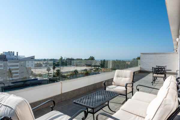 We are pleased to present this bright and modern penthouse in the best location in Nueva Andalucía! Enjoy modern living within proximity to all the amenities you need; grocery stores, bars, restaurants, schools, health center, golf courses, gym, and much more. A perfect choice for both families and investors. In a 20-minute walk you will reach the sea and the lovely promenade that stretches from San Pedro via Puerto Banús to Marbella Center. The apartment has three bedrooms, two bathrooms, a kitchen, a living room, and a terrace with generous spaces for relaxation and entertainment. A garage space and a storage room are included. Don't miss this unique opportunity to invest in one of Marbella's fastest-growing residential areas!