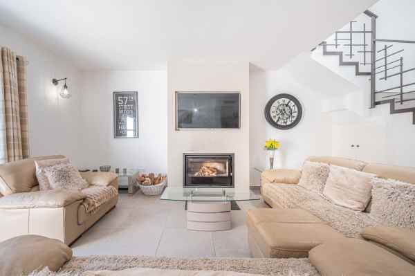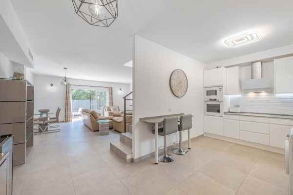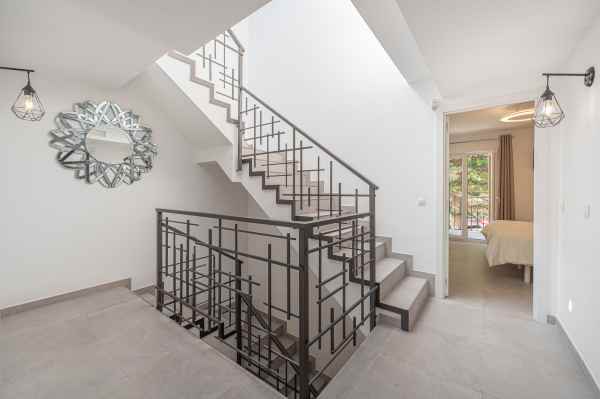 On the ground floor, you will find a modern fully-fitted kitchen, a spacious living-dining area with direct access to the terrace, and a guest toilet.