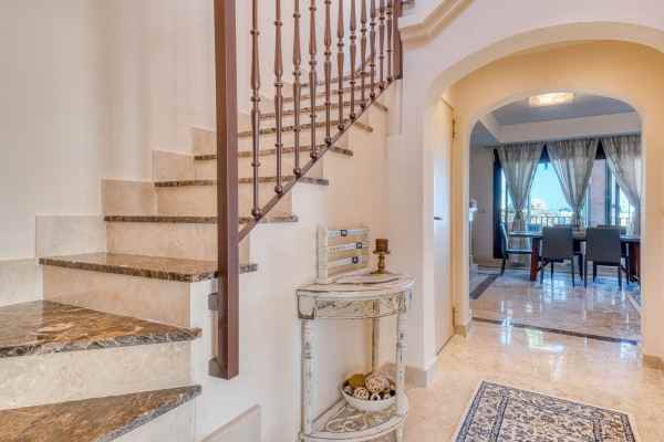 A striking double-height entrance hall sets the tone for the sense of space throughout. The contemporary kitchen is fitted with premium appliances and opens to a versatile glass-enclosed room, ideal for dining or relaxation. The open-plan living and dining area flows seamlessly onto a covered terrace enclosed with glass curtains, creating an inviting year-round setting with tranquil garden and sea views. Upstairs are three generous bedrooms and two elegant bathrooms. The principal suite enjoys a private terrace overlooking the sea and golf course, while the guest bedrooms share a beautifully appointed bathroom.