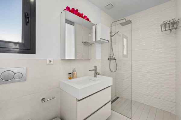 Outside, a fantastic private outdoor area awaits, designed for relaxation and socializing. The private swimming pool can be heated and offers a built-in swim trainer - ideal for exercise all year round. In addition, there is a seating area with air jets (semi-jacuzzi), where you can relax and enjoy the bubbles after a swim. There is also an outdoor shower so you can cool off if you don't prefer to jump in the pool.