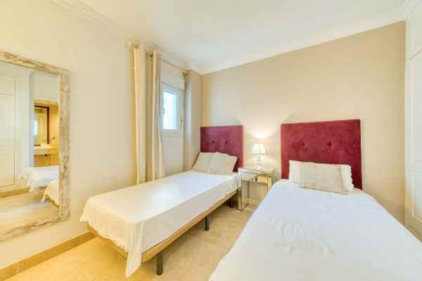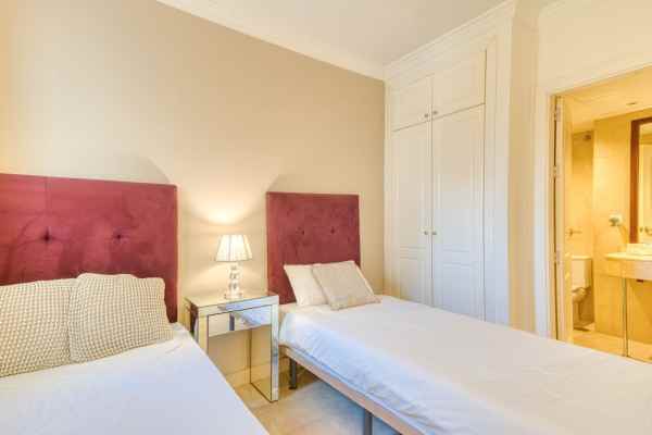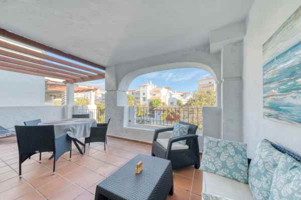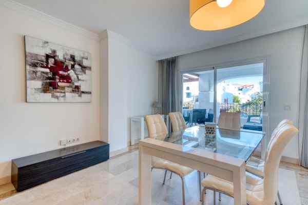 This elegant three-bedroom apartment is ideally located within a highly sought-after gated development just 350 metres (a 4 minute walk) from the beach in San Pedro de Alcantara. This spacious property sits opposite the NAC Padel Club and exclusive I/O Gym and is surrounded by stunning tropical gardens with a large free-form swimming pool. Positioned on the first floor, the property enjoys a dual aspect and a spacious south-facing terrace, perfect for outdoor dining. The layout briefly includes an entrance hall, a bright living and dining area, a fully fitted kitchen with an enormous, separate utility room, and a guest toilet. There are three bedrooms in total, two of which feature en-suite bathrooms, plus a third slightly smaller bedroom, and the kitchen also benefits from a Juliet balcony overlooking the stunning community swimming pool.