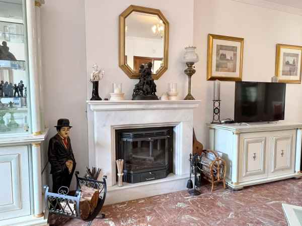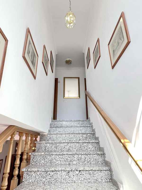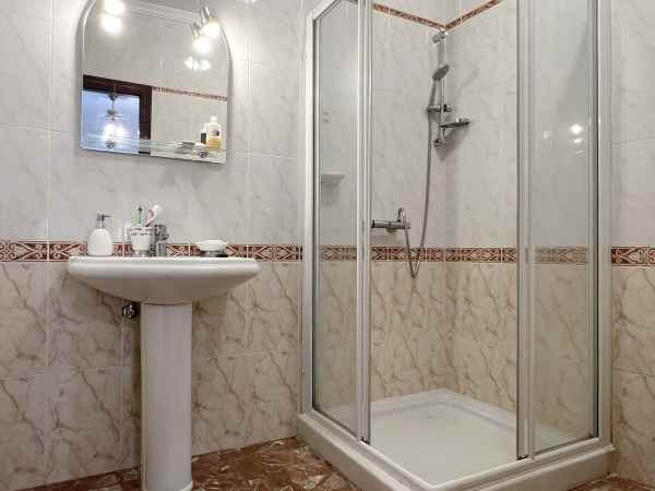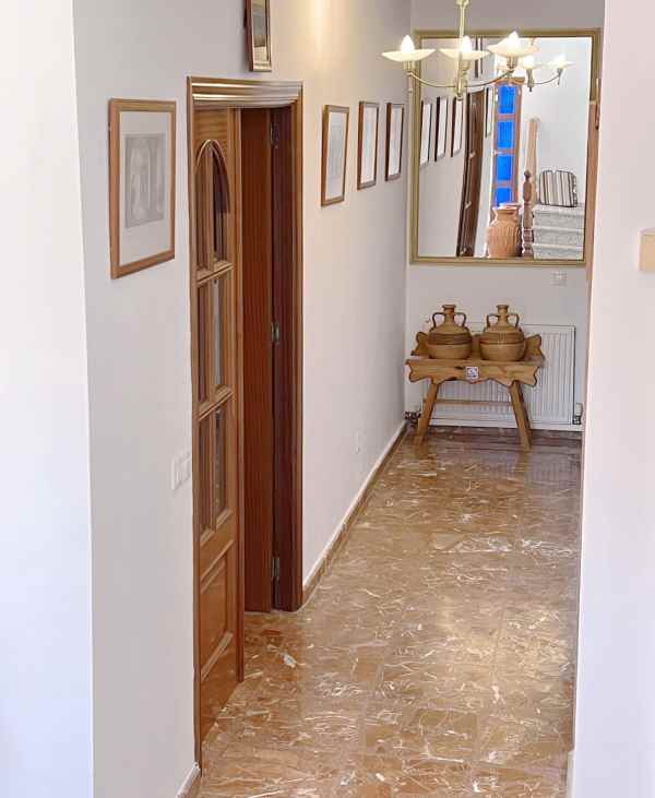 Entrance hall, large living-dining room with fireplace and patio door leading to west garden. Marble floors. Huge fitted kitchen with breakfast area. A/C h+c. Wifi. Storage space under the stairway, ideal for storing sports equipment or to use as a small workshop/hobby room. Large bedroom with wardrobe. Full bathroom.