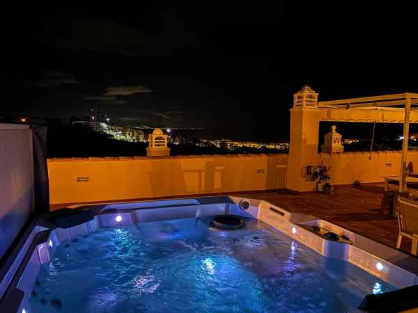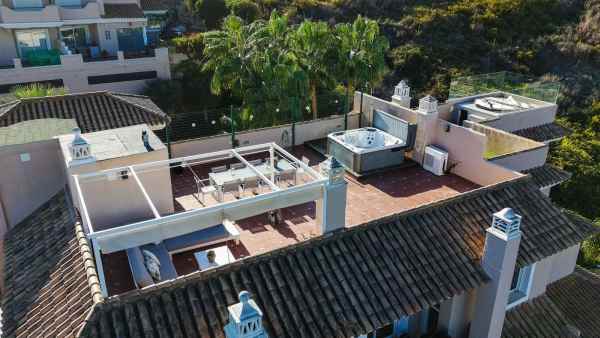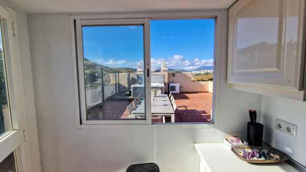 The open-plan living area flows effortlessly onto a private terrace, where panoramic views stretch across the landscape and beyond. An impressive solarium provides additional outdoor space — ideal for entertaining or unwinding — complete with an outdoor kitchen and jacuzzi for enjoying the warm Spanish evenings in total privacy. in addition you get to enjoy communal swimmingpools in plural and lush, wellkept gardens, throughout the urbanisation.
