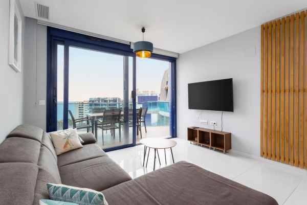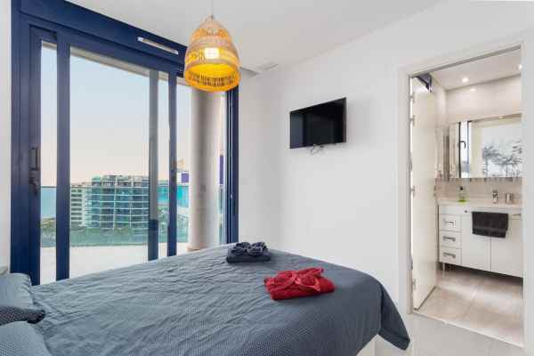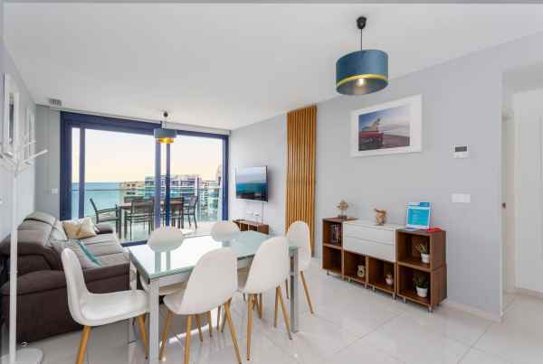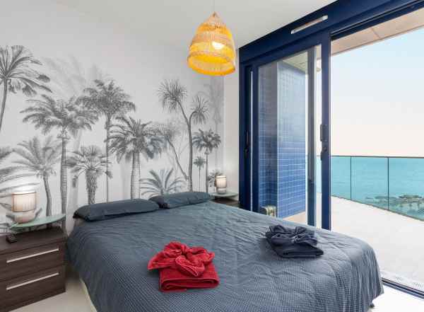 The apartment is located at the top of the building on floor 9 of 9 (elevator available), in a compound with that little extra, where you have the Mediterranean Sea and the beach as one of your closest neighbors.