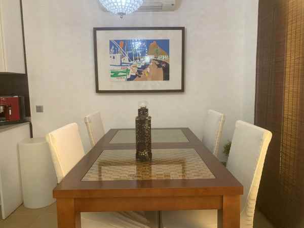 The house has a consistently inviting feeling and is in good condition, the surfaces are lightly furnished and there is a consistently good flow of light. The living room and kitchen are in an open plan and there is plenty of space in the room for both a lounge area with a sofa and a dining area for four people. The kitchen has good storage options in upper and lower cupboards and good work surfaces.