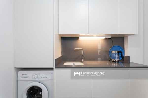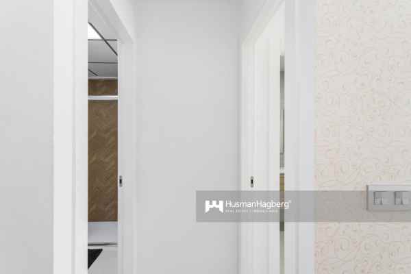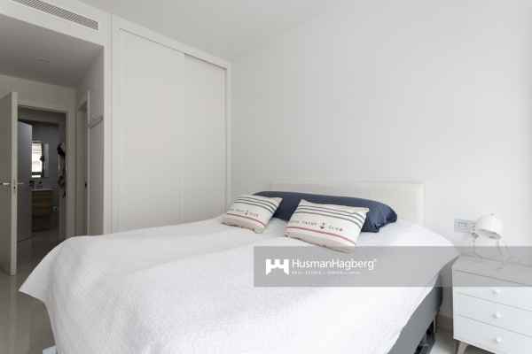 The apartment itself is tastefully decorated and thoughtfully planned with two peaceful bedrooms, both with built-in wardrobes for smart storage. The separate kitchen is fully equipped and invites you to both everyday meals and long dinners in good company. The living room creates a homely atmosphere with both air conditioning and central heating, making the home comfortable regardless of the season. Double-glazed windows further contribute to comfort and keep noise and temperature in balance.