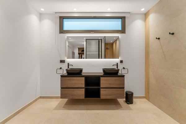 The property's southwest orientation ensures natural light throughout the day and beautiful sunset views over the valley. A grand circular driveway accommodating 10 cars leads to the main entrance, setting the tone for the property’s elegance. The ground floor opens to a spacious entrance flowing through to the bright living area and modern open-plan kitchen extending out to two dedicated dining areas featuring impressive vaulted ceilings. Three of the villa’s en-suite bedrooms are located on this level, each featuring large windows that connect the interior to the terraces with views out to the spacious garden. The lower level has been designed for leisure and entertainment and an additional two bedrooms ensure comfort and privacy for guests. A stylish games room with a lounge area and pool table serves as a social hub, while a fully equipped laundry room adds convenience to daily living. Natural materials, wood accents, and elegant tile work throughout create a warm and inviting atmosphere that complements the villa’s contemporary aesthetic.