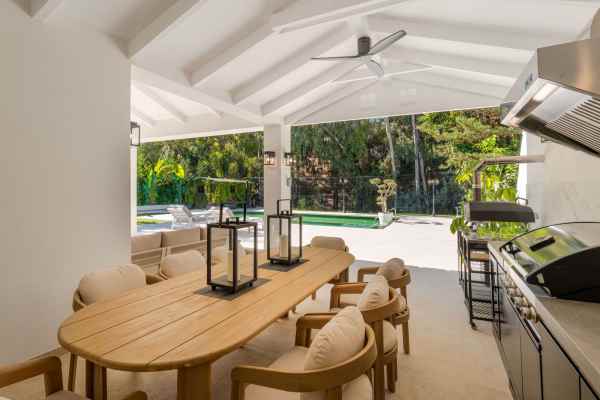 Outdoors, the villa continues to impress. Beautifully landscaped gardens surround a private swimming pool, pre-installed for heating, allowing year-round enjoyment. The terraces feature a dedicated outdoor kitchen, dining space, and chill-out zones ideal for alfresco living. The villa offers total privacy and spaciousness while maintaining a close relationship with the natural surroundings, creating a true oasis within one of Nueva Andalucía’s most exclusive communities.