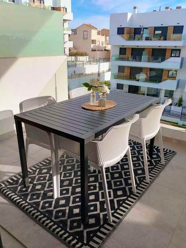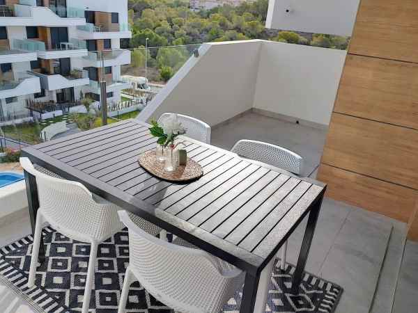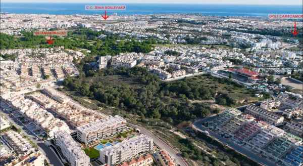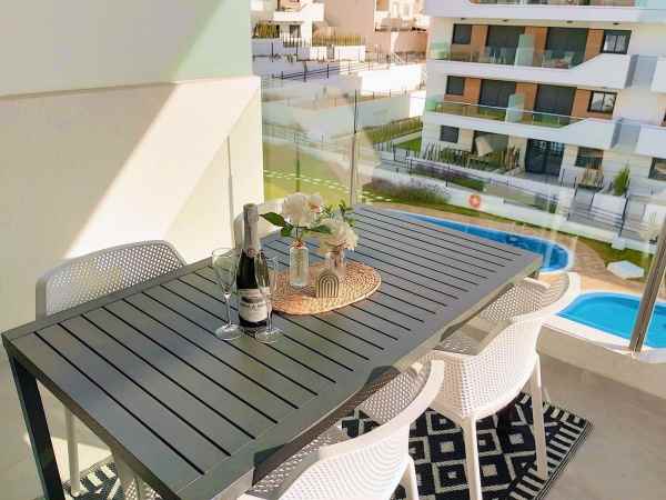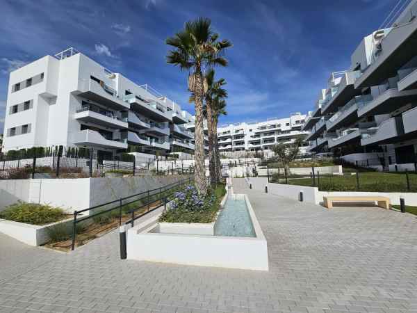 Aire Residencial is located in Orihuela Costa (Villamartin Golf area), designed for those seeking the Mediterranean lifestyle in a quiet yet well-established area, less than 8 minutes from the beach and with all amenities within easy reach. The gated community comprises gardens with 4,400m² and has 2 large swimming pools, a jacuzzi and 2 petanque courts. The property is located on the 2nd Floor and consists of 2 bedrooms with fitted wardrobes, 2 bathrooms, living/dining area and a fully fitted kitchen. The property benefits with a storage room, air conditioning, Private terrace overlooking the communal swimming pool and gardens and there is also underground parking space where you can park your car or store bicycles.