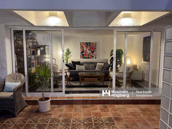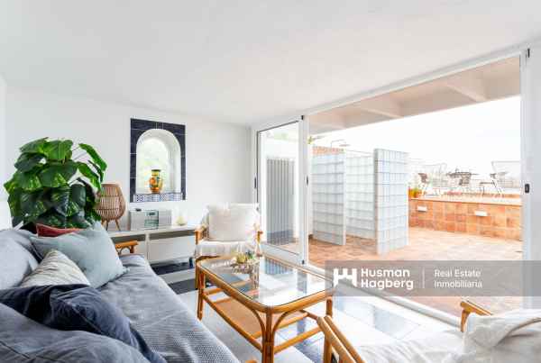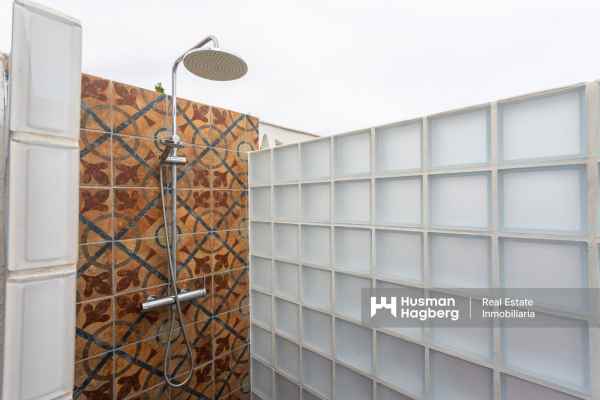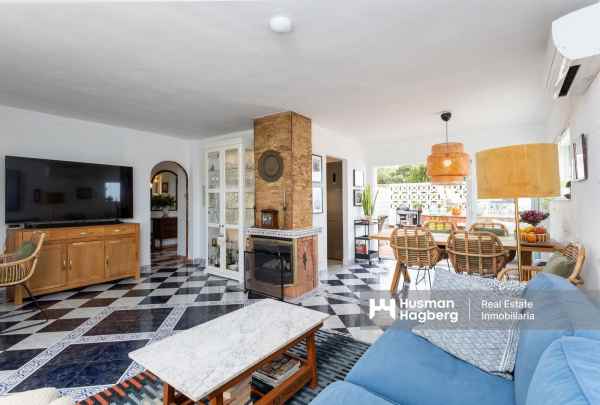 When you step inside, you are greeted by a welcoming hallway that leads up to the heart of the house, where the living room and kitchen flow together in an open and social layout. Here, large windows create a generous amount of light and the living room's fireplace adds warmth and coziness on cooler evenings. From both the living room and kitchen, you reach the newly renovated terrace, raised slightly above ground level, with an outdoor shower, both hot and cold water - with a glazed part that lets you enjoy the view all year round. The terrace offers a view of the sparkling sea and becomes a natural place for breakfast in the sun, dinners with family and friends or quiet moments in the shade. A south-facing balcony is also accessed via the living room.
