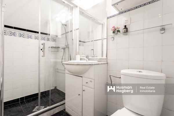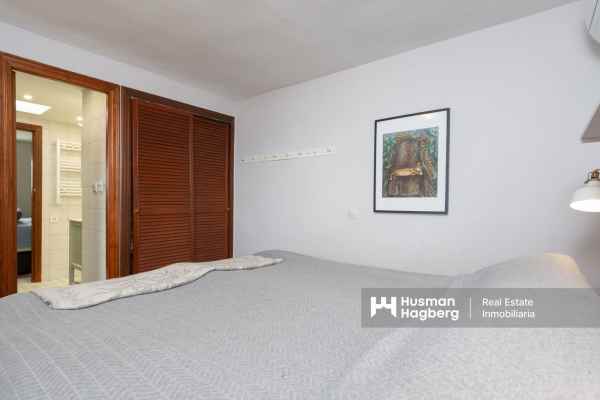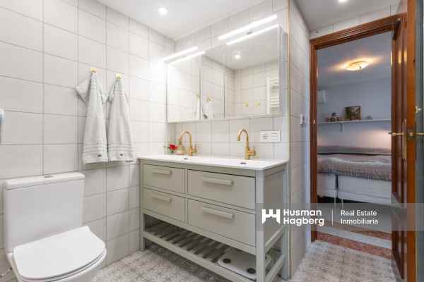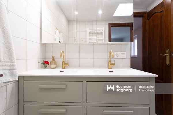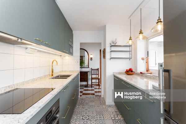The kitchen is tastefully renovated with a modern design, plenty of work surfaces and well-lit storage solutions. On this floor there are also two bedrooms that share a newly renovated bathroom with rain shower and underfloor heating, creating a practical and comfortable part of the house for everyday life.