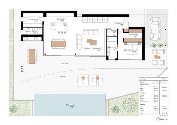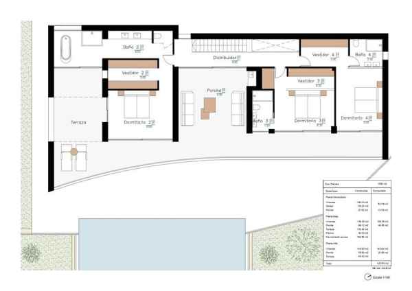 Villa with exquisite design, as well as high-quality interior finishes, sea views from both floors, as well as unobstructed views of the pine forest. The property has a living / dining room with open equipped kitchen with cooking island, laundry room, 4 bedrooms with dressing room and bathroom en suite, guest toilet, outside bathroom, chill-out area on the top floor with unbeatable views of the sea, a large space in the basement (partially mentioned finish not included), summer kitchen, double garage and covered parking. The covered built area is 680 m2 plus 222 m2 of terraces. Infinity pool of 11 meters.The villa will be equipped with a modern kitchen with all appliances, Aerothermal air conditioning system (floor heating and duct air conditioning), bathroom furniture, built-in wall taps, technical LED lighting, large-format porcelain floors, a complete garden with automatic irrigation system, etc. Located in the exclusive area of Moravit in a quiet area, in a dead end street, beach and shops, restaurants and services, all within 1 km.