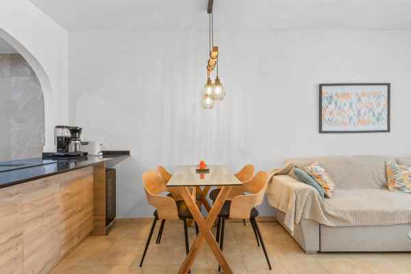 The property includes two bedrooms, a bathroom, a functional kitchen, and a cozy living room with access to a glazed terrace. This terrace serves as a comfortable additional living space year-round, leading out to your private, fenced garden area—a perfect spot to unwind and enjoy outdoor moments. An air-conditioning unit ensures pleasant temperatures throughout the year.