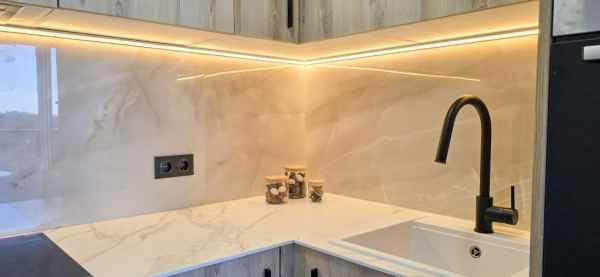 The fully equipped kitchen includes LED ambient lighting and top-tier German-made Bosch appliances, including a dishwasher and washing machine, all selected for performance and reliability.