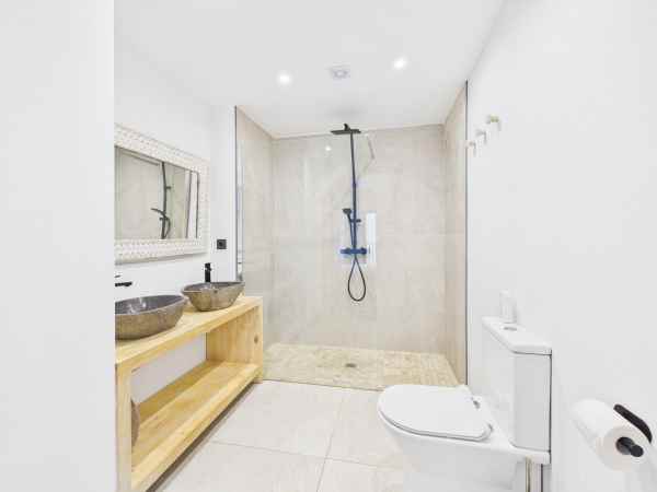 Each of the three bedrooms offers space and serenity, while the contemporary bathrooms showcase high-end fixtures and stylish stone basins. Underfloor heating throughout ensures year-round comfort.