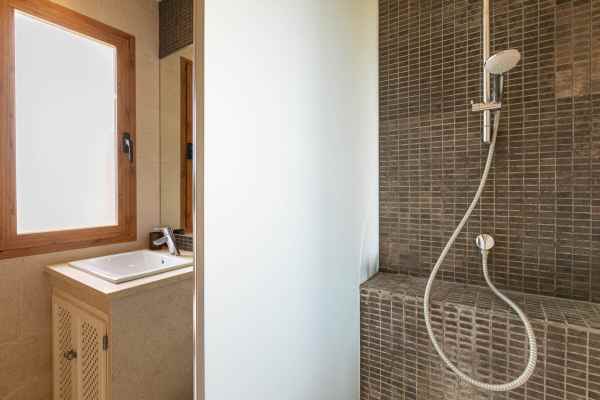 Two bedrooms and two ensuite bathrooms, with a living room and open kitchen that has access to a terrace overlooking the garden.