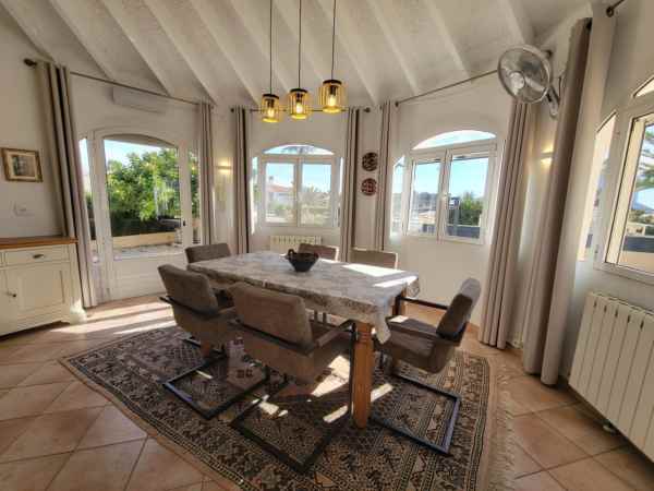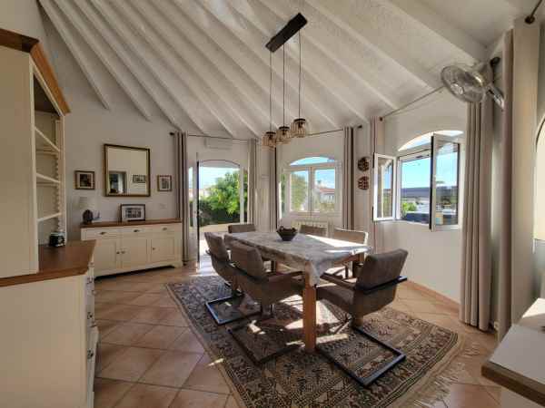 This house has a south-facing glazed terrace, allowing for abundant sunlight throughout the day. Here, you can relax while admiring the beauty of the surroundings or enjoy outdoor meals thanks to its attractive layout. The garden offers space for various activities, from family gatherings to relaxing afternoons by the 5x10 private pool.