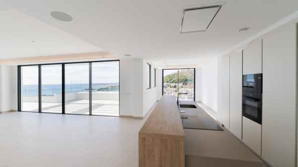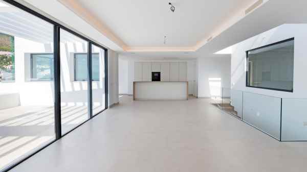 The main space combines a designer kitchen, dining room and living room in an open-plan concept that flows onto a south-west facing terrace. Here you can enjoy outdoor living on a spectacular, large terrace with a private swimming pool.