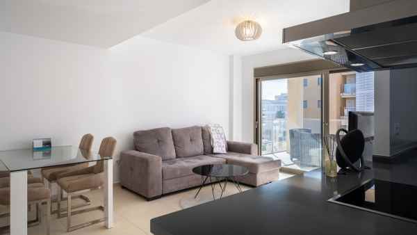 The open-plan layout creates a harmonious sense of space, naturally connecting the kitchen, dining area, and living room – perfect for both relaxation and social gatherings. From the living room, you step out onto the generous south-facing terrace, where you can enjoy many lovely hours in the sun and even catch a glimpse of the sea on the horizon.