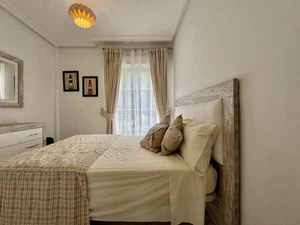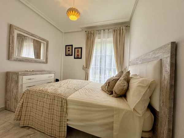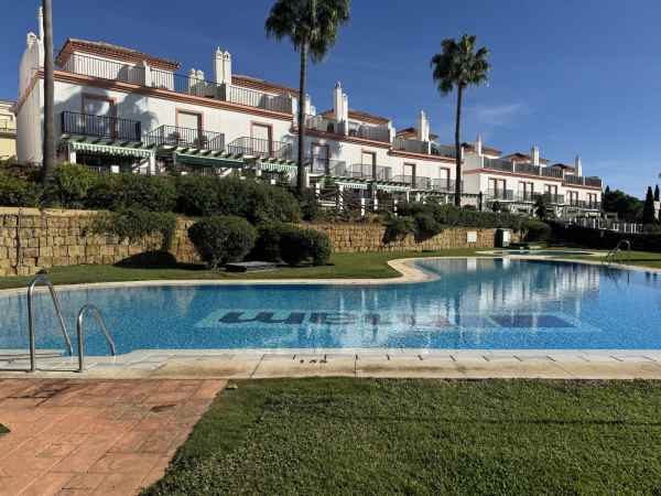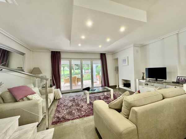 This attractive three bedroom house is located in a frontline golf position while still being walking distance to the beach. The house has three real bedrooms on the upper level and two bathrooms plus a guest toilet. Many owner have even added an extra bedroom and bathroom in the basement/garage while this owner has choosen to keep the garage and storage space. The owner has improved the property with an amazing modern kitchen false ceilings with spot lights giving the property a modern feel. With two nice terraces on the lower level and also a roof terrace one has plenty of outdoor space to really allow one to enjoy the Spanish climate. The complex is gated with two swimming pools.