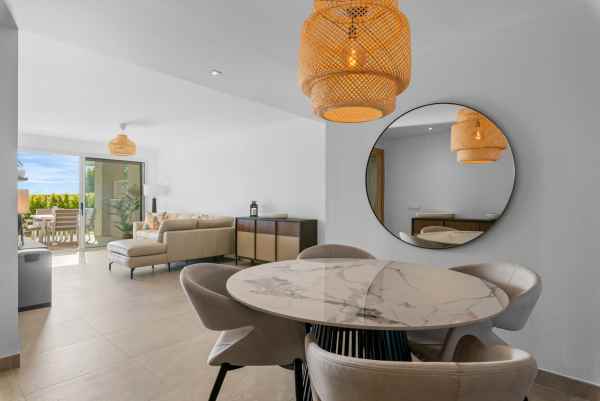 The property overlooks the communal pool and enjoys west-facing views across the golf course. The layout includes an open-plan main living area with air conditioning and a fully fitted kitchen equipped with dishwasher, oven, hob, washing machine and dryer. The space opens directly onto a covered terrace and a small private garden.