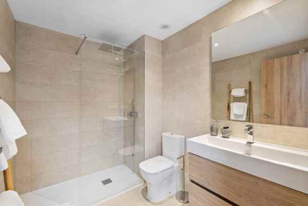 There are two bedrooms and two bathrooms. The principal bedroom includes an en-suite shower room and has direct access to the terrace. The second bedroom is served by a separate bathroom. Both bedrooms have air conditioning.