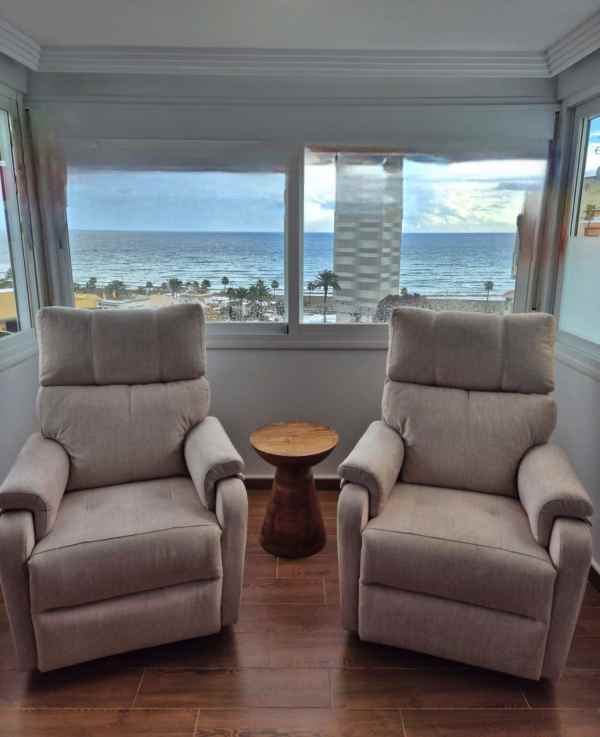 Spanning 40 m² of bright, south-east-facing space on the sixth floor with convenient lift access, this apartment has been meticulously refurbished for modern comfort: new electrical and plumbing systems, a high-efficiency air conditioning unit, luxurious electric blinds on all windows, a premium 180 x 200 cm box-spring bed, a fully equipped kitchen with top appliances, a redesigned bathroom with underfloor heating, a secure door, and a pre-installed alarm system. Relax in ultimate style with two electric reclining armchairs, soaking up the stunning panoramic sea views that flood the space with natural light. The building's rooftop terrace is available for residents, enhancing outdoor enjoyment.