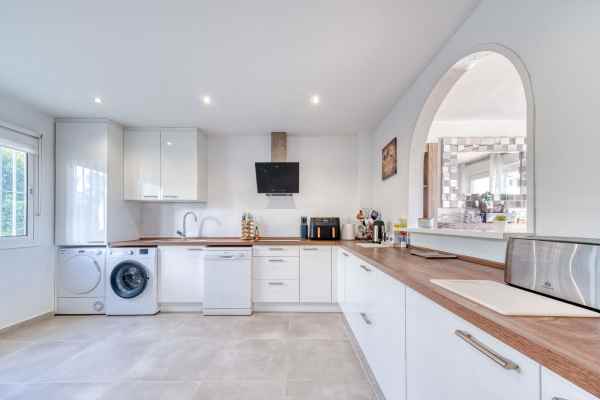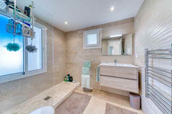 The ground floor features a brand new kitchen with premium appliances, sleek cabinetry, and stone surfaces that open naturally into a bright, spacious living area. Large new windows fill the interior with natural light and create a fresh, inviting atmosphere. Each of the three bedrooms is fitted with elegant built in wardrobes, while the redesigned bathrooms showcase contemporary fixtures, high end finishes, and tasteful lighting. The home is fully air conditioned for year round comfort. A standout feature is the photovoltaic solar installation that supports lower energy costs and reflects a thoughtful, sustainable approach to modern living. Outdoor areas are equally impressive with a private garden ideal for quiet mornings and relaxed evenings, along with a generous roof terrace that captures open views and coastal breezes. The large communal swimming pool offers a resort style experience within a peaceful residential setting.