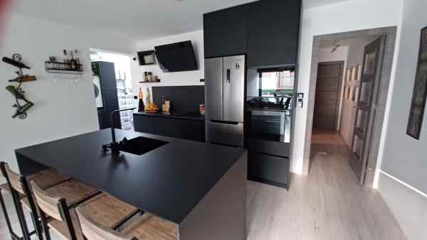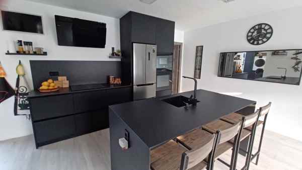The living room and kitchen are combined into a bright and open space with space for both a lounge area and a dining area. The kitchen is modern and has dark cabinets with good storage options and a dark countertop with generous work surfaces.